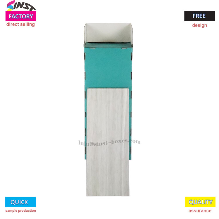 Dette korrugerte skjermstativet for skrivesaker brukes hovedsakelig til å vise forskjellige skrivesaker. Hele kroppen er rektangulær og er laget av lyst tre eller hvitt imitert trekornmateriale, som ser forfriskende og strukturert ut. Tre åpne oppbevaringsrom er spesialdesignet foran, i grønne eller blågrønne farger, som er perfekte for sortering og oppbevaring av skrivesaker. Enten det er bøker, forskjellige notatbøker eller forskjellige penner, kan de alle plasseres trygt inne. Dessuten har dette utstillingsstativet en lett skrånende trapesformet struktur, noe som gjør det lettere å nå og plassere gjenstander på det uten mye anstrengelse.