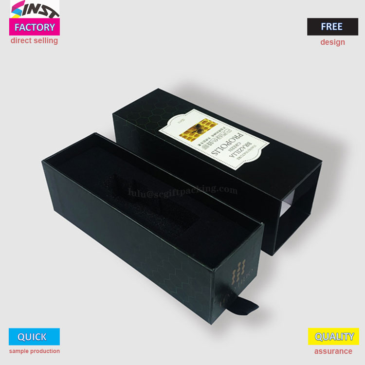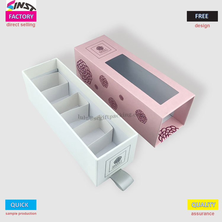 Den luksuriøse stive skuffen Skyvegaveboksen Emballasje for eterisk olje er designet som en tofarget gaveeske, med en kollisjon av rosa og svarte farger for å skape en enkel og luksuriøs følelse - den rosa boksen er pyntet med dype lilla blomster/lilla mønstre, og kommer med et gjennomsiktig vindu for en direkte oversikt over innholdet; Det indre fôret har en hvit skillelinje og en trekkfane -design, noe som gir enkel utvinning med bare et skånsomt trekk. Fem separate rom er tilgjengelige for lagring av smykker, skjønnhetsprøver eller 30 ml propolisflasker, noe som sikrer et rent og bekymringsfritt miljø. Kan brukes som en neglelakk limgaveeske, gaveeske, eksempler på gaveeske, osv .;