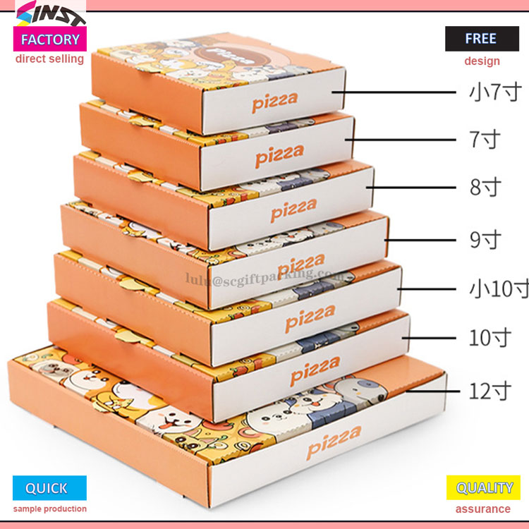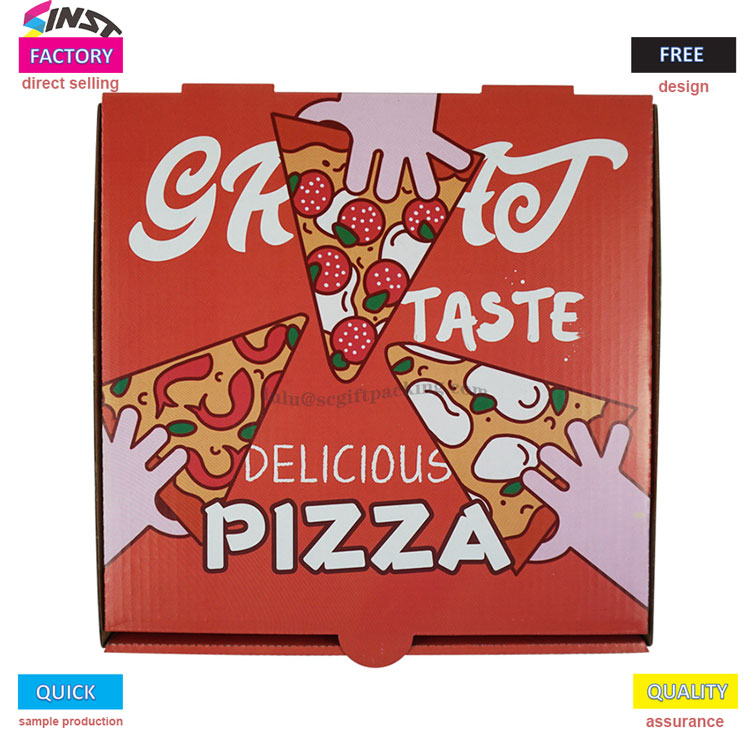 Denne utsøkte røde, tykke kumhinnen pizza bølgeboks er laget av trelags tykt bølgepapir, med flere stiler og størrelser å velge mellom; Vårt selskaps utvalg av materialer er veldig forsiktig, helt trygt og miljøvennlig. Pizzaboksen har utsøkte mønstre, lyse overflatebehandlingsfarger og er solid og varmebestandig. For å forhindre at pizzaen blir myk, har boksen 2 store hull og 6 små luftventiler ;; Selvfølgelig kan tilpasning også gjøres etter kundens behov,