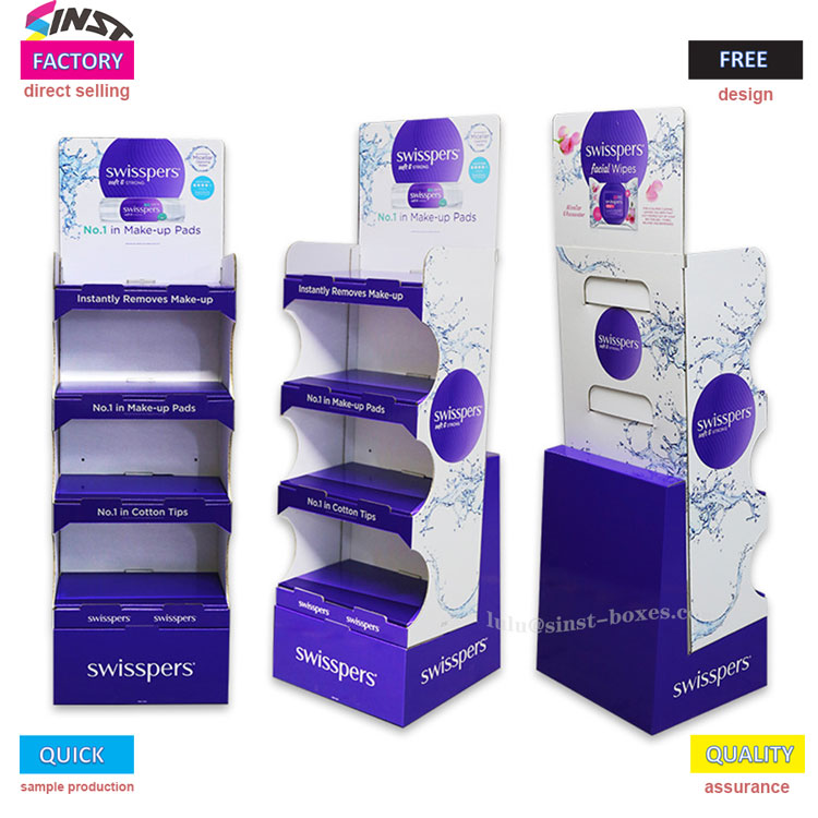 Displaystativet for våtservietter er designet med flere lag, hver med riller for å holde små gjenstander som våtservietter og bomullspinner sikkert, noe som gjør det enkelt å komme til. Materialet er papp, som er lett og enkelt å ordne, og det er også praktisk å fylle på. Det tilhører typen displayverktøy som ser enkelt ut og står stødig når det brukes.