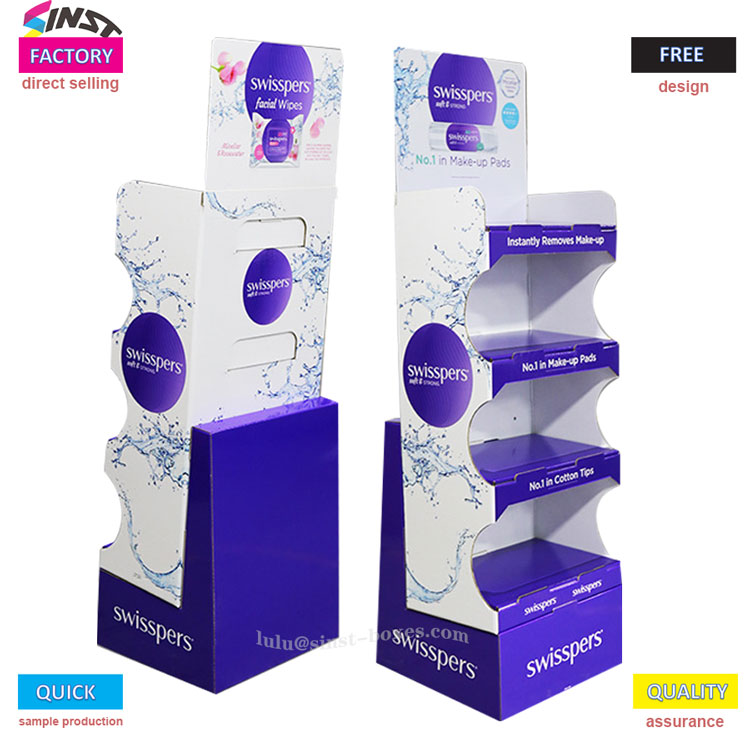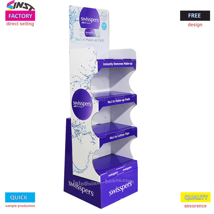 Vårt displaystativ for våtservietter har et stort vannspraymønster trykt på forsiden, samt et lilla ovalt område. De nedre lagene av partisjoner er merket med lilla tagger som leser "Rask sminkefjerning", "Top Makeup Cotton Sales" og "Top Cotton Swab Sales". Etikettene nederst er små i størrelsen, men de er alle produktfordeler.